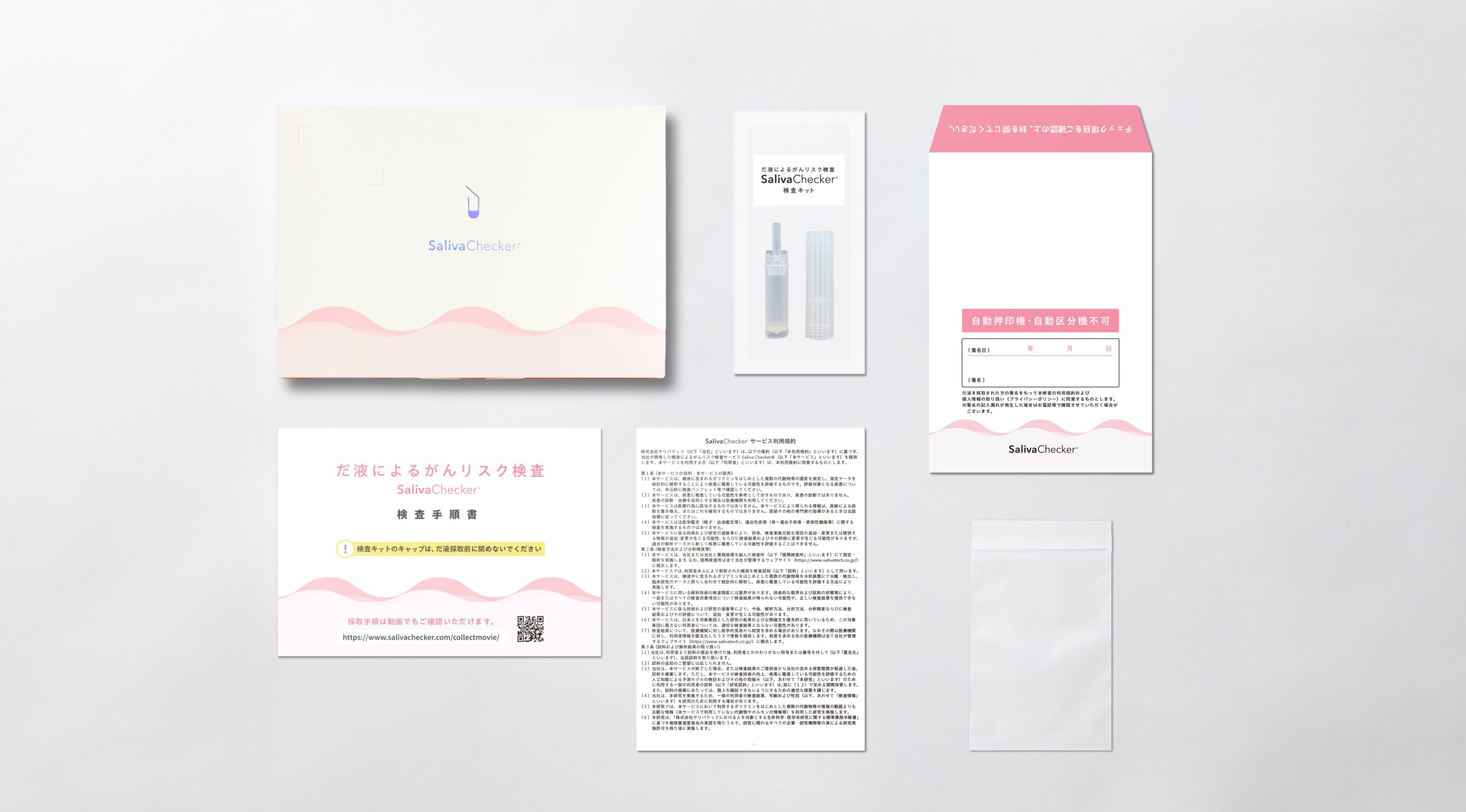 | 内容物 | 検査手順書 サービス利用規約 ストロー付き採取容器(試薬入り) 保存袋 返送用封筒 |